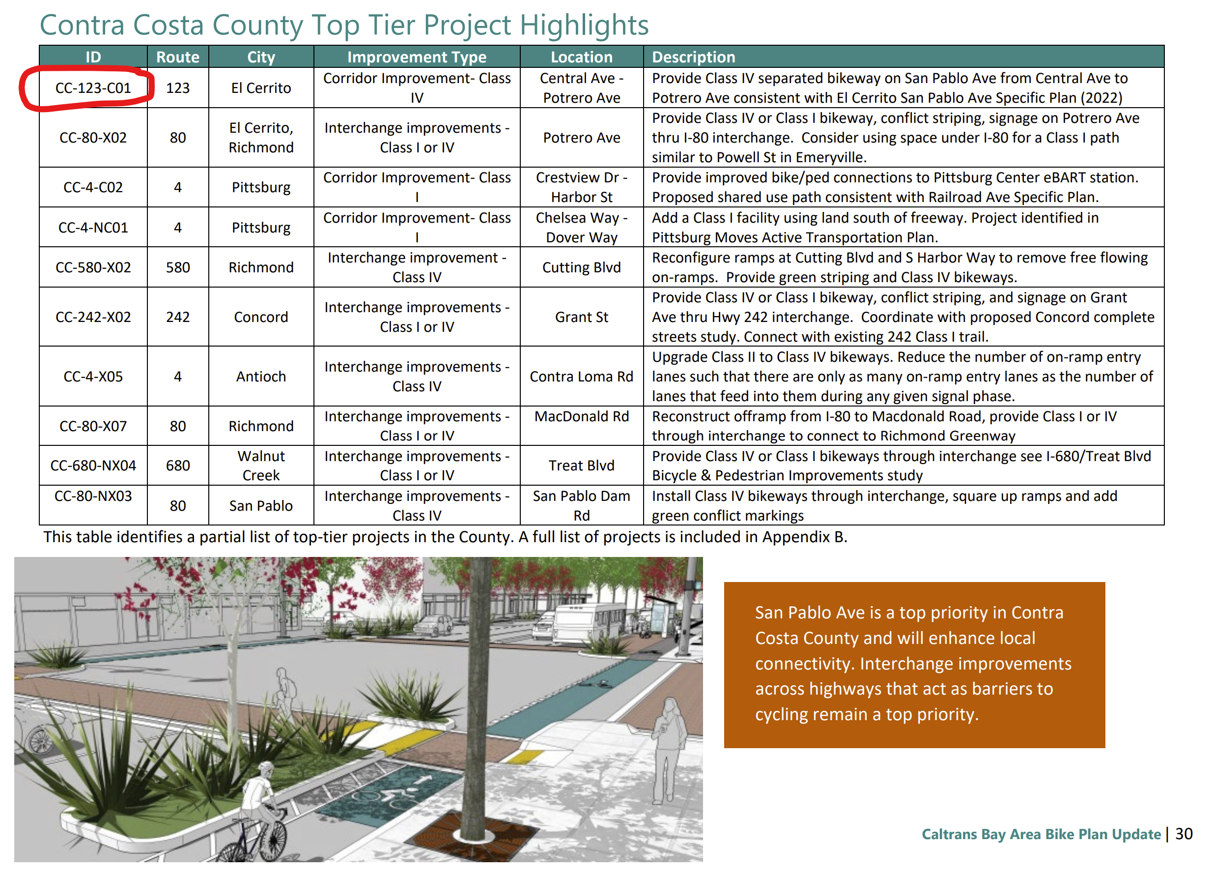 Adding a Class IV bikeway on San Pablo Avenue is as a Top-Tier project in the Caltrans Bay Area Bike Plan, updated in 2025.